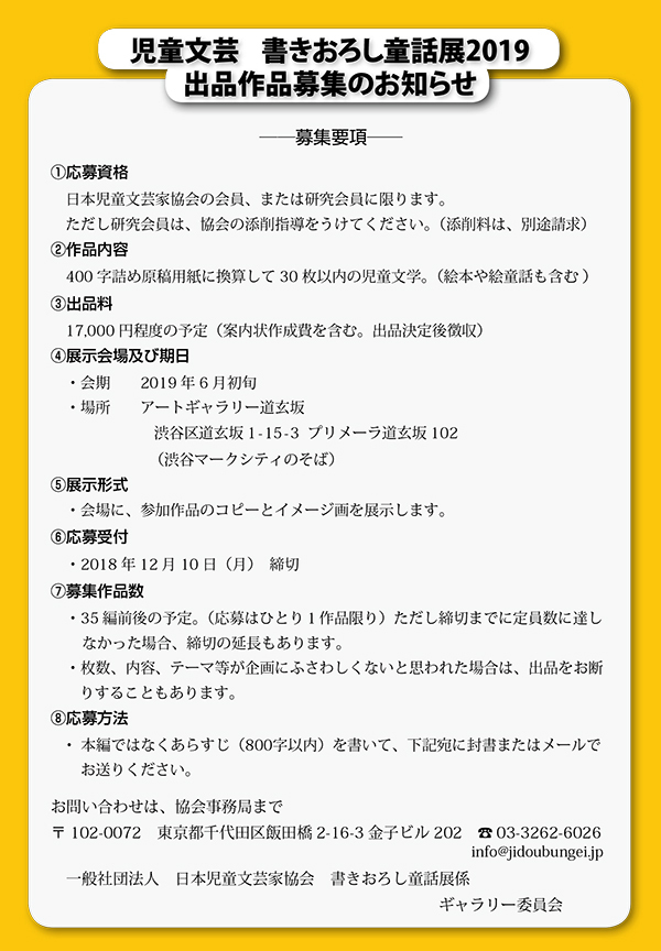 6月3日(月)から10日(月)まで、渋谷のアートギャラリー道玄坂で「児童文芸 書きおろし童話展2019」を開催しています。