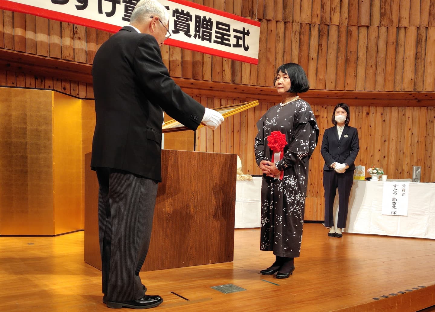 すとうあさえさんには、賞状、「一筋の道」レリーフ、副賞の賞金と地産品が贈呈されました