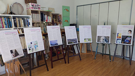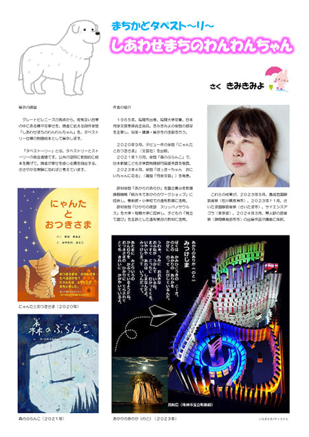 グレートピレニーズの視点から、何気ない日常の中にある様々な幸せを、読者に伝える創作童話「しあわせまちのわんわんちゃん」を、タペストリー仕様の物語絵本として展示しています。